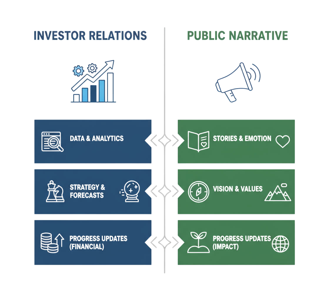 While your investor and public communication should align in intent, they must differ in tone and content. Think of them as two complementary lenses, one internal and strategic, the other external and inspiring.